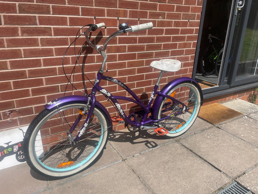 A Pre Loved Electra Bicycle Company Hawaii 24” wheel Adult Size Beach Cruiser For Sale, 3 speed, front V brake, rear coaster brake, Schwinn Stingray style American Import.