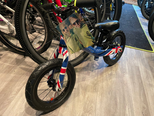 A Pre Loved Frog Bike For Sale, Blue Frog Tadpole Balance Bike, very lightweight, rear V brake, padded seat, excellent condition, nationwide delivery is available.