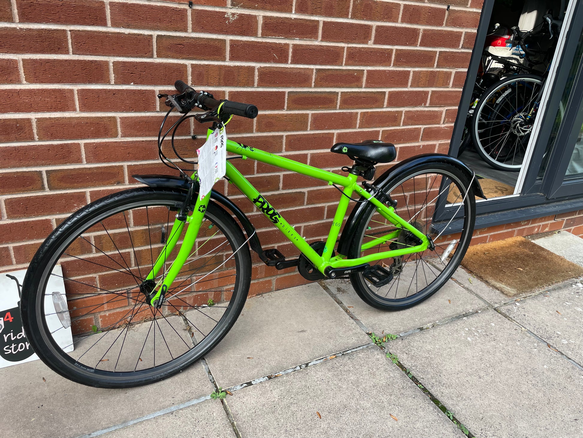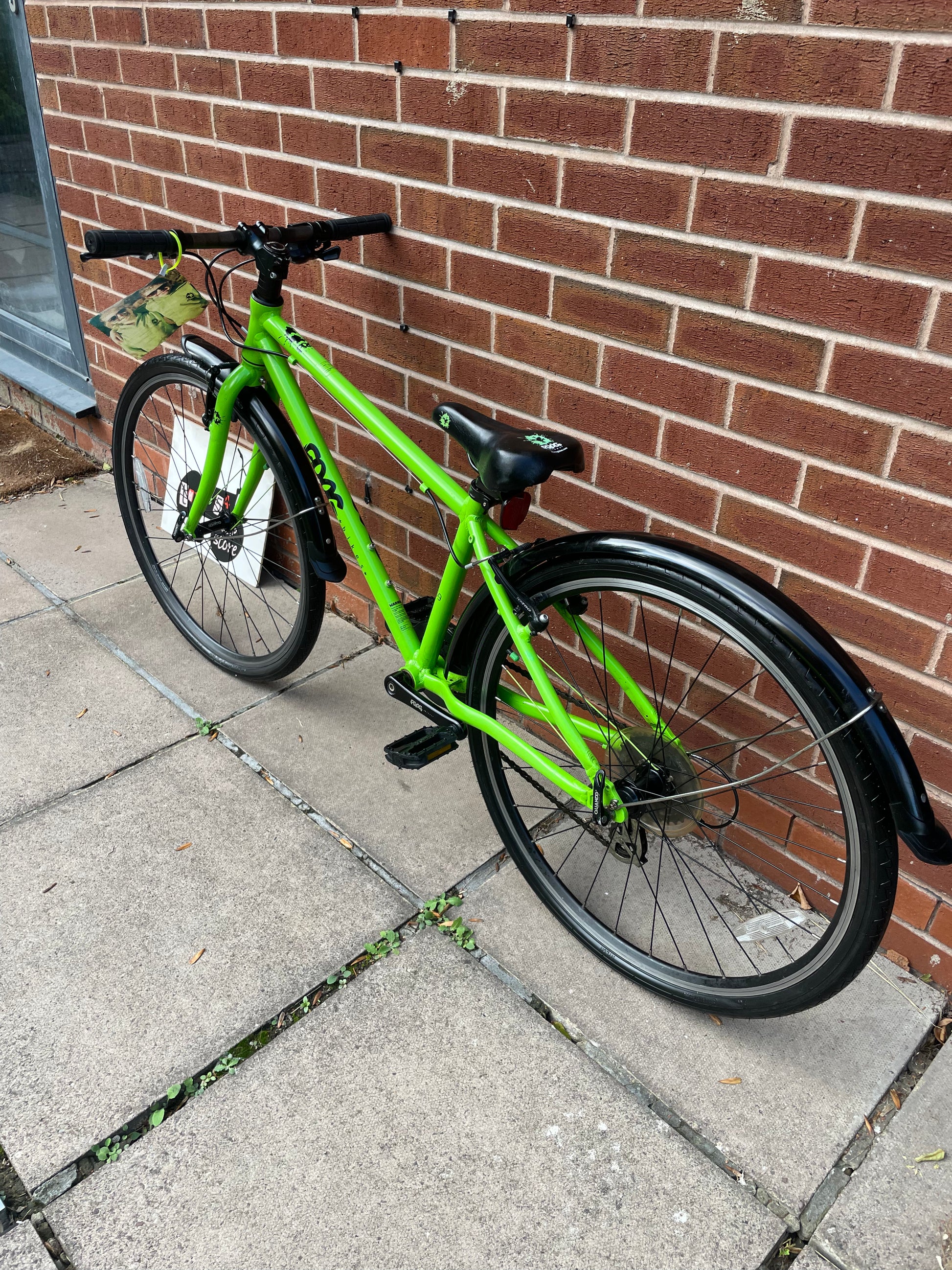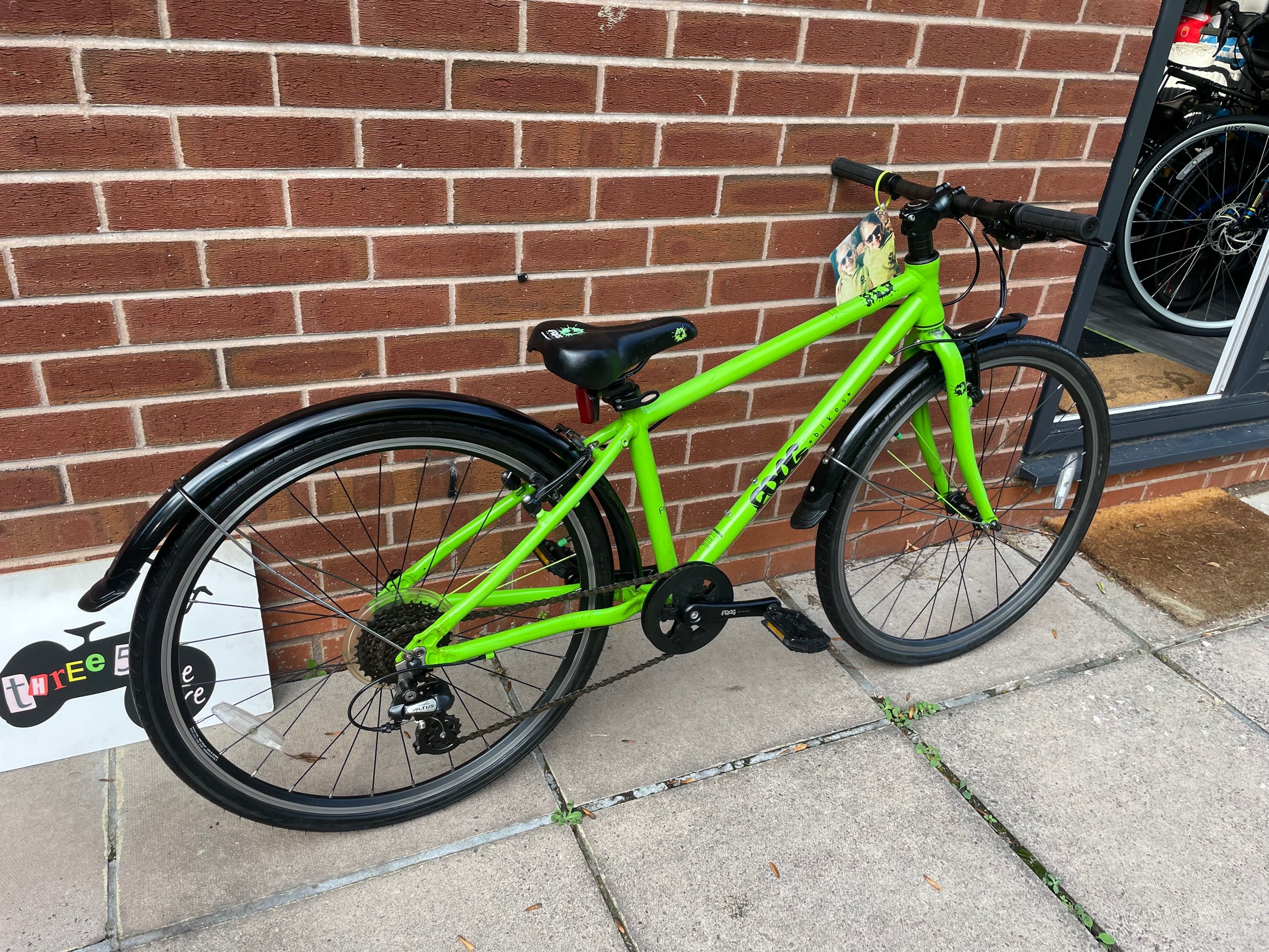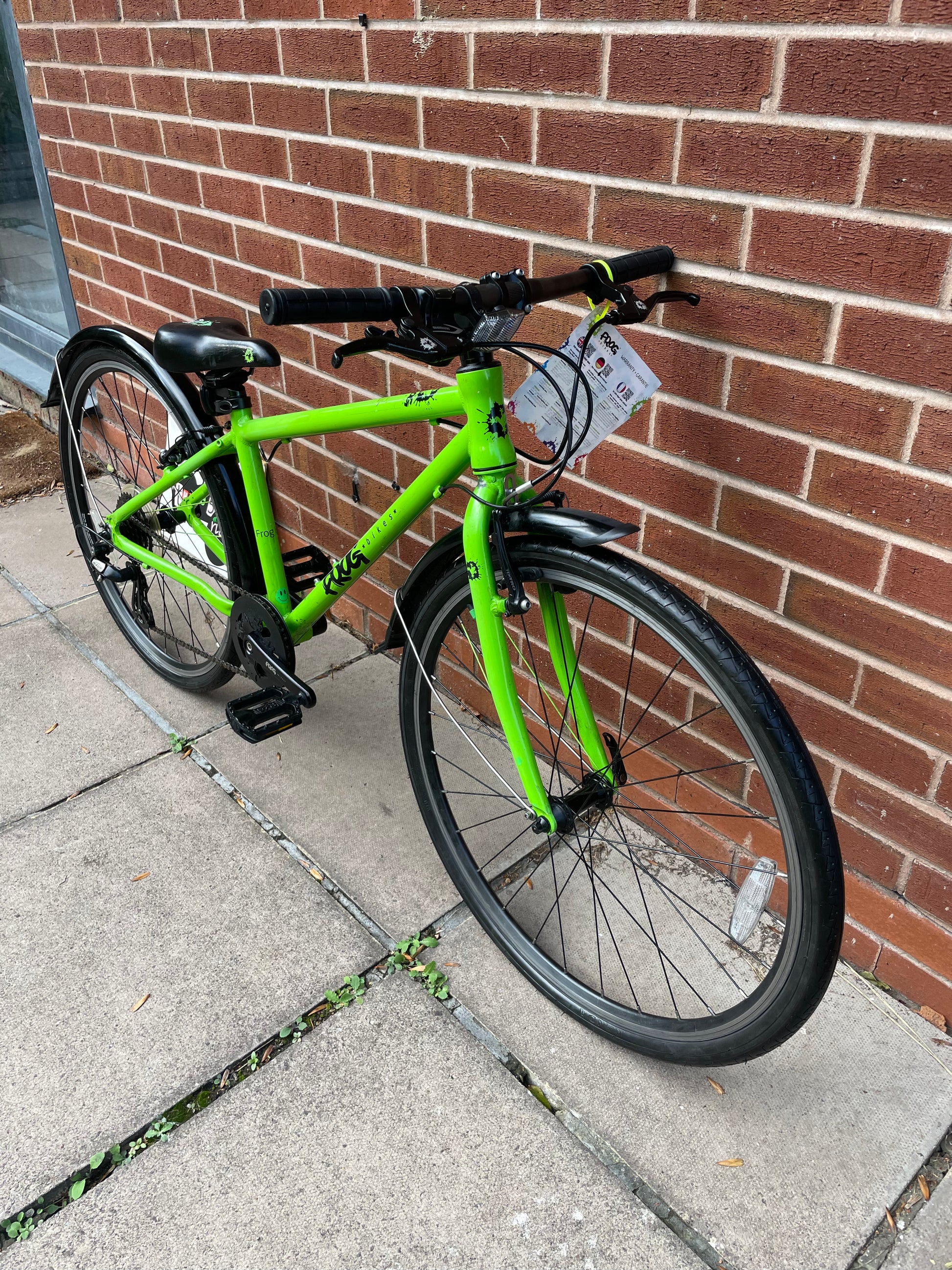 A Pre Loved Frog Bike For Sale, Green Frog 69 26” wheel hybrid bike, 8 speed, V brakes, mudguards, very lightweight, excellent condition, nationwide delivery is available or collection from our shop in Warwickshire.