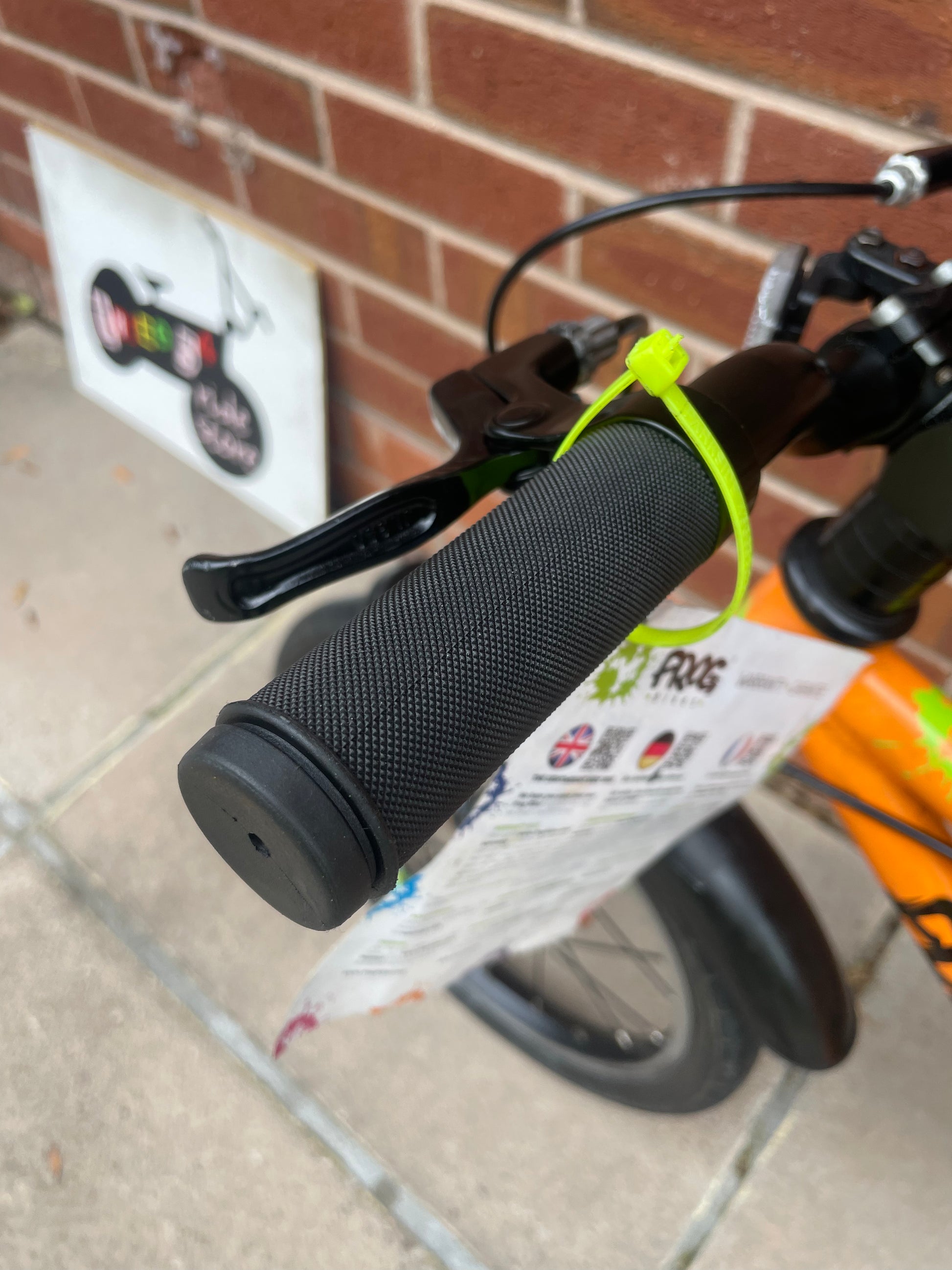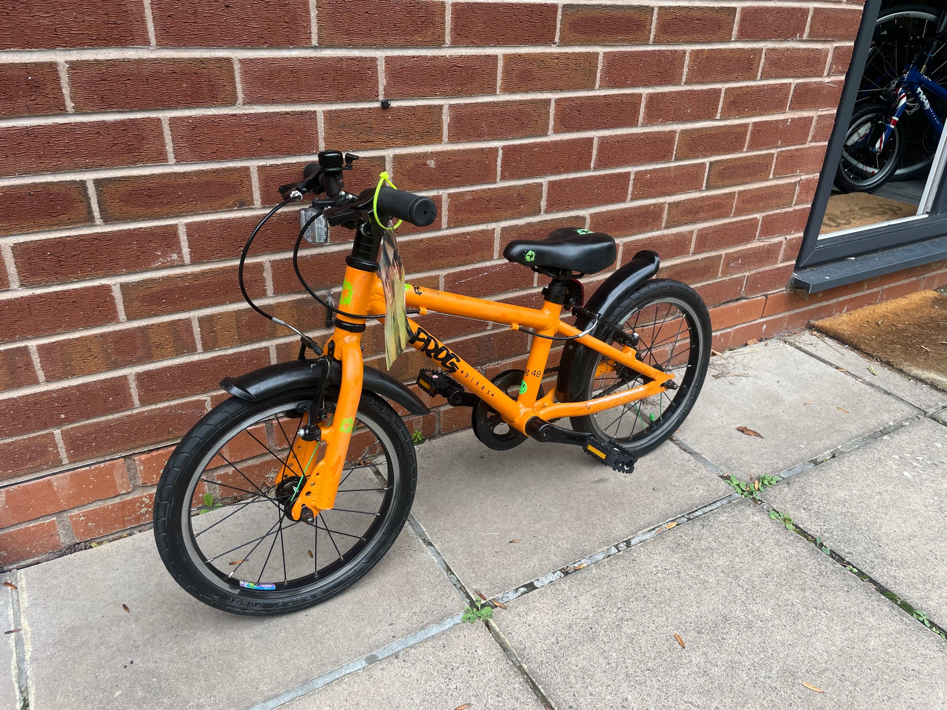 A Pre Loved Frog Bike For Sale, Orange Frog 48 first pedal bike, lightweight, 16β wheels, mudguards, V brakes, nationwide delivery is available or collection from our shop in Warwickshire.
