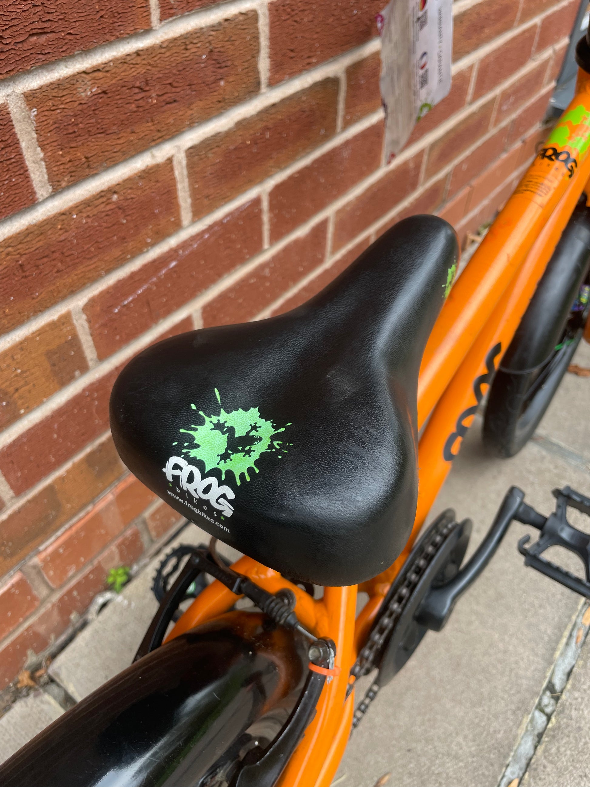 A Pre Loved Frog Bike For Sale, Orange Frog 48 first pedal bike, lightweight, 16β wheels, mudguards, V brakes, nationwide delivery is available.