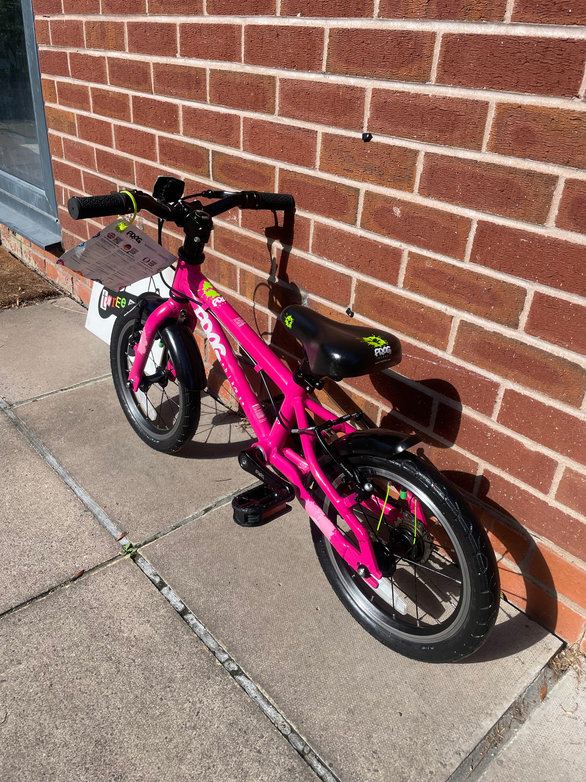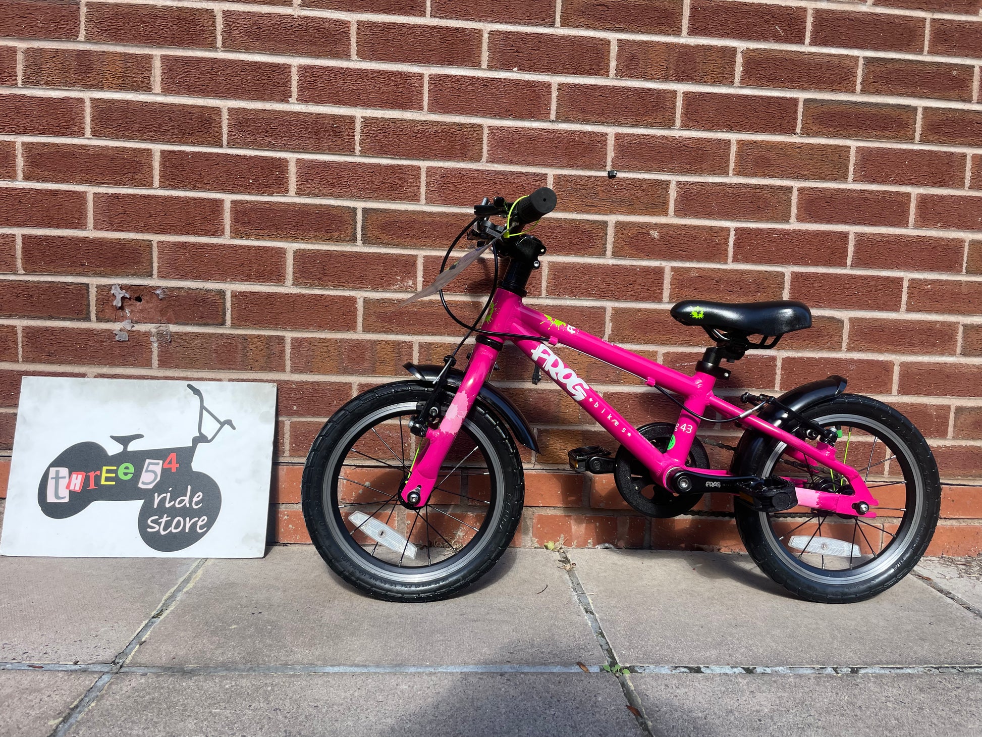 A Pre Loved Frog Bike For Sale, Pink Frog 43 first pedal bike, 14” wheels lightweight children’s bicycle, V brakes, padded seat, can be used as a balance bike, excellent condition, nationwide delivery is available or collection from our shop in Warwickshire, same size bike as a Frog 40 and the new Frog 38.