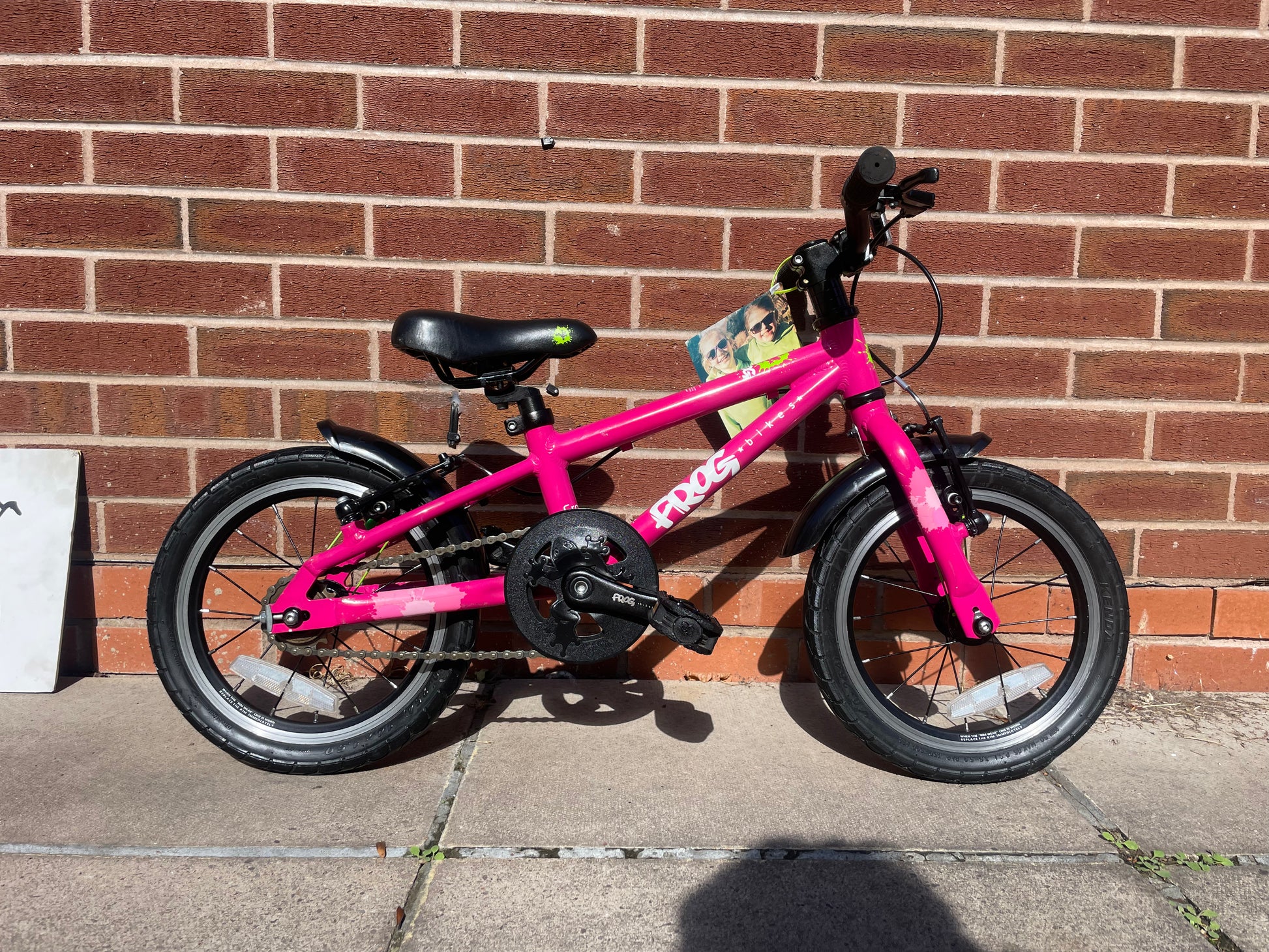 A Pre Loved Frog Bike For Sale, Pink Frog 43 first pedal bike, 14” wheels lightweight children’s bicycle, V brakes, padded seat, can be used as a balance bike, excellent condition, nationwide delivery is available.